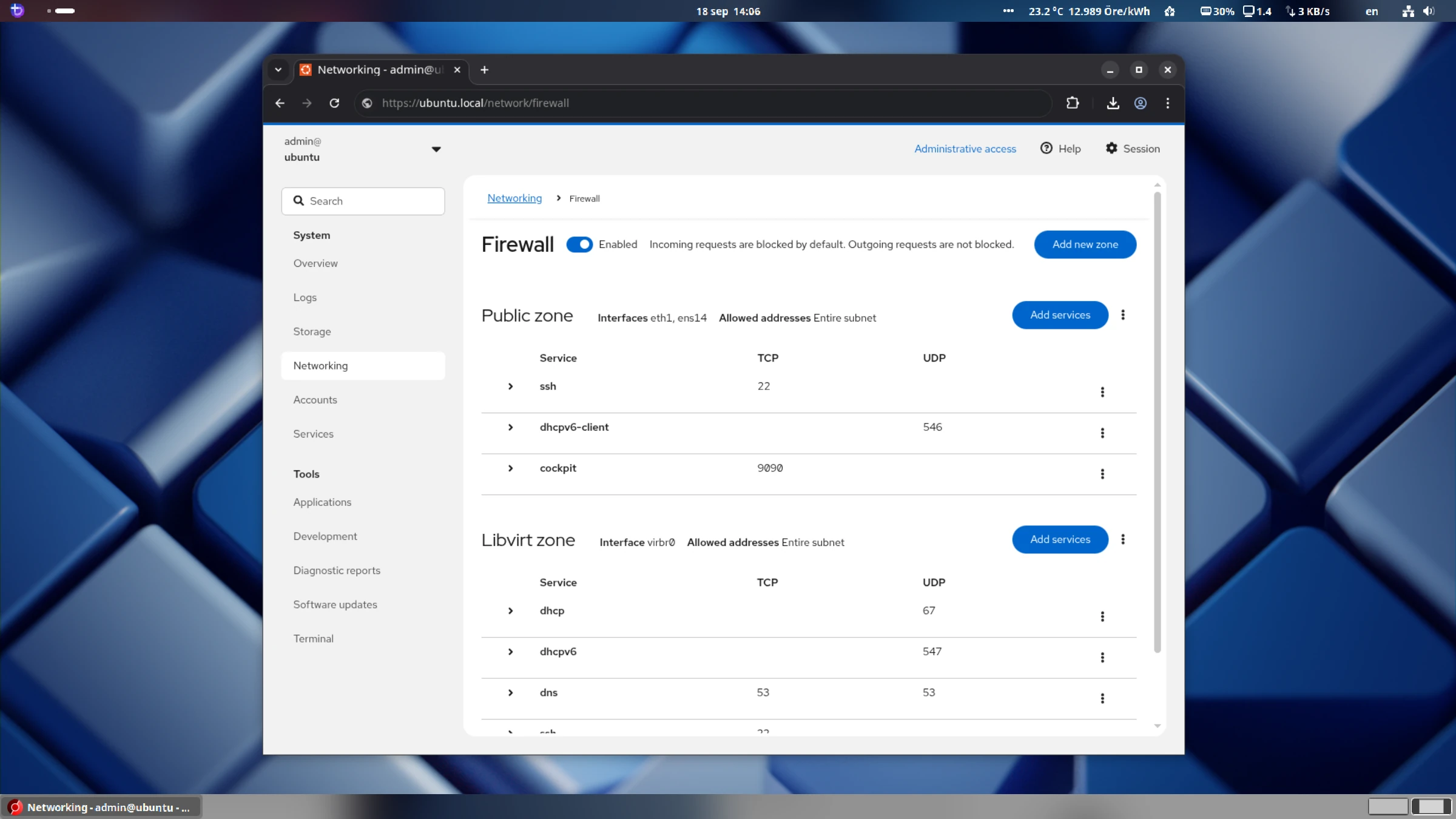 After installing and enabling Cockpit, visit port 9090 on your server (for example: https://localhost:9090/ in a browser on the same machine as Cockpit).